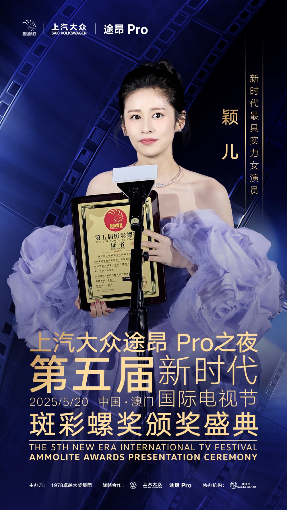 由上汽大众途昂Pro倾情赞助的第五届新时代国际电视节斑彩螺奖5月20日晚在澳门澳门银河举行盛大的颁奖典礼,评选范围是2024年2月1日至2025年3月31日在中国内地、台湾、香港和澳门两岸四地主流电视台和视频网站播出的华语剧集,入围新时代最具突破5位女演员董洁、倪虹洁、史可、杨茜尧、颖儿。她们在自己的作品中大放溢彩,获得观众好评,最终颖儿凭《六姊妹》斩获最具实力女演员奖项。
